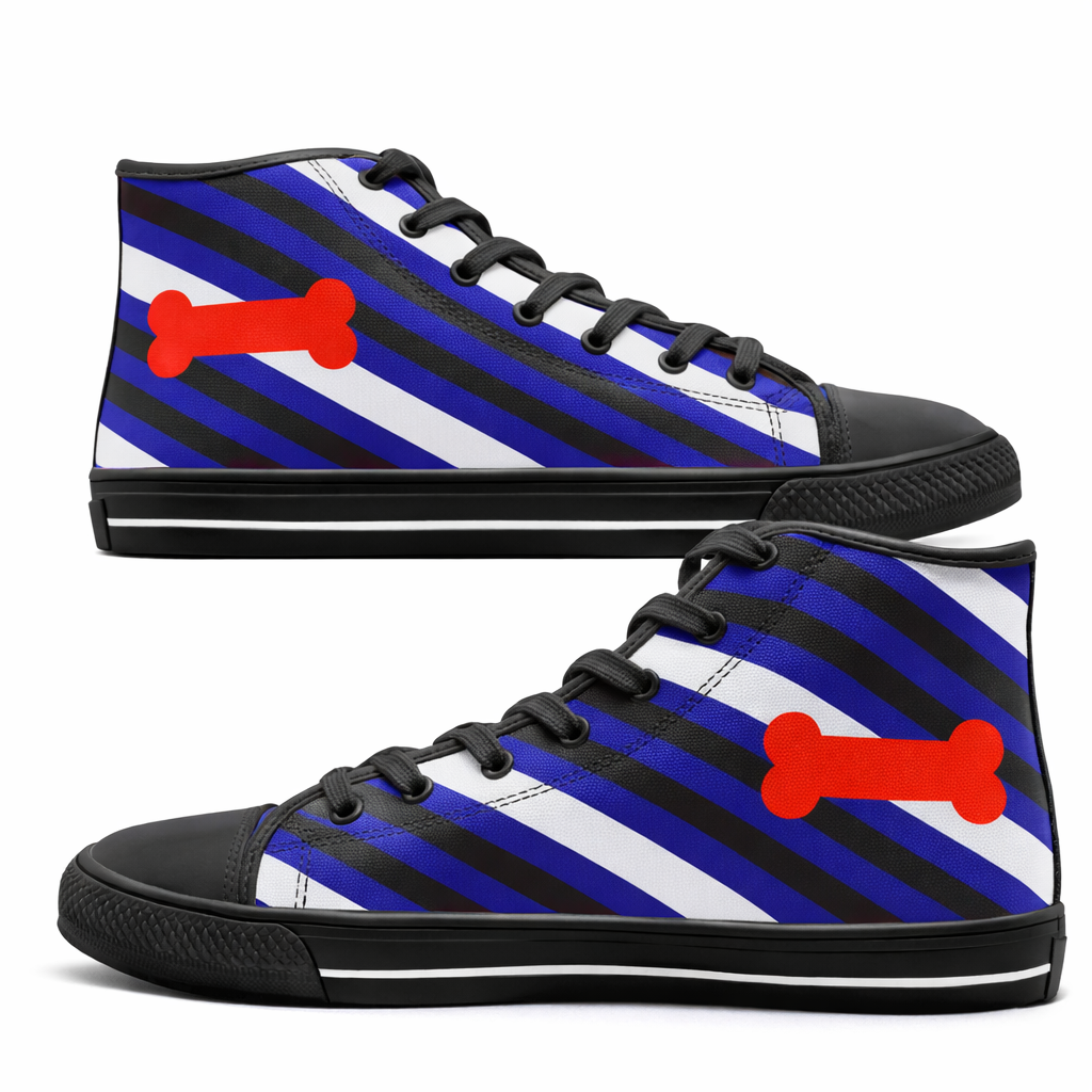 Express your identity loud and proud with our Puppy Play Shoes. This striking design features the recognized Puppy Pride flag pattern: diagonal stripes of royal blue, black, and white, centered with a vibrant red bone. Whether for community events, pride parades, or everyday wear, these sneakers are a conversation starter. While they differ from our typical anime shoes, they offer the same high-quality build. These are the versatile canvas shoes women and men can wear to social gatherings or club nights. If you are concerned about safety on the dance floor and ask, “are converse non slip?”, rest assured. We have upgraded the outsole to provide superior traction comparable to vans non slip shoes, keeping you steady on your paws.