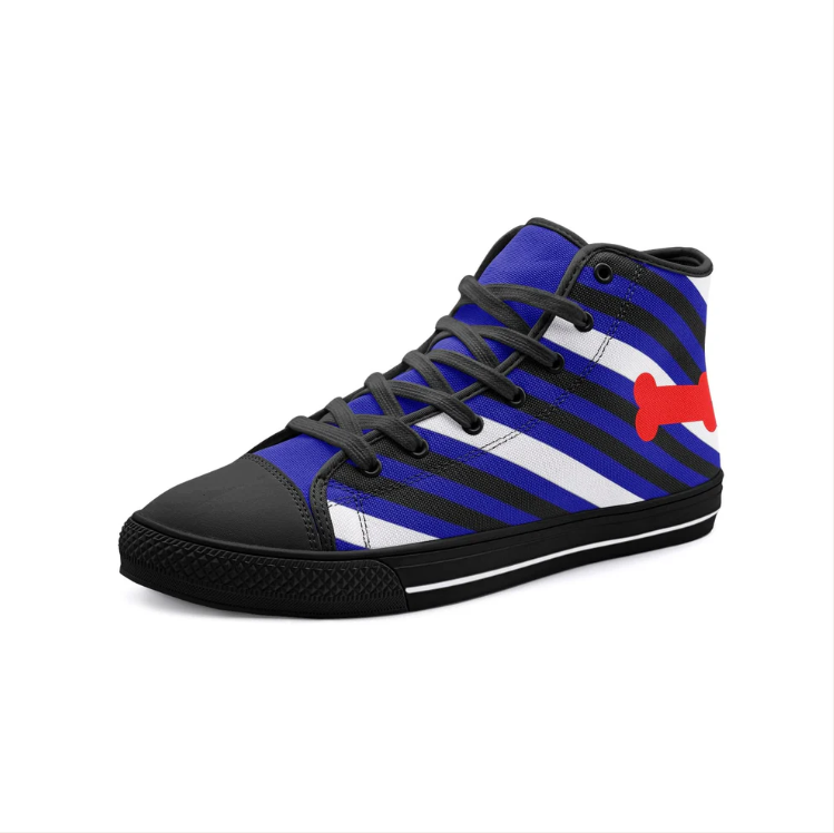 🦴 Unleash Your Side: Show your pride with these bold high tops featuring the iconic blue, black, and white stripes and red bone.