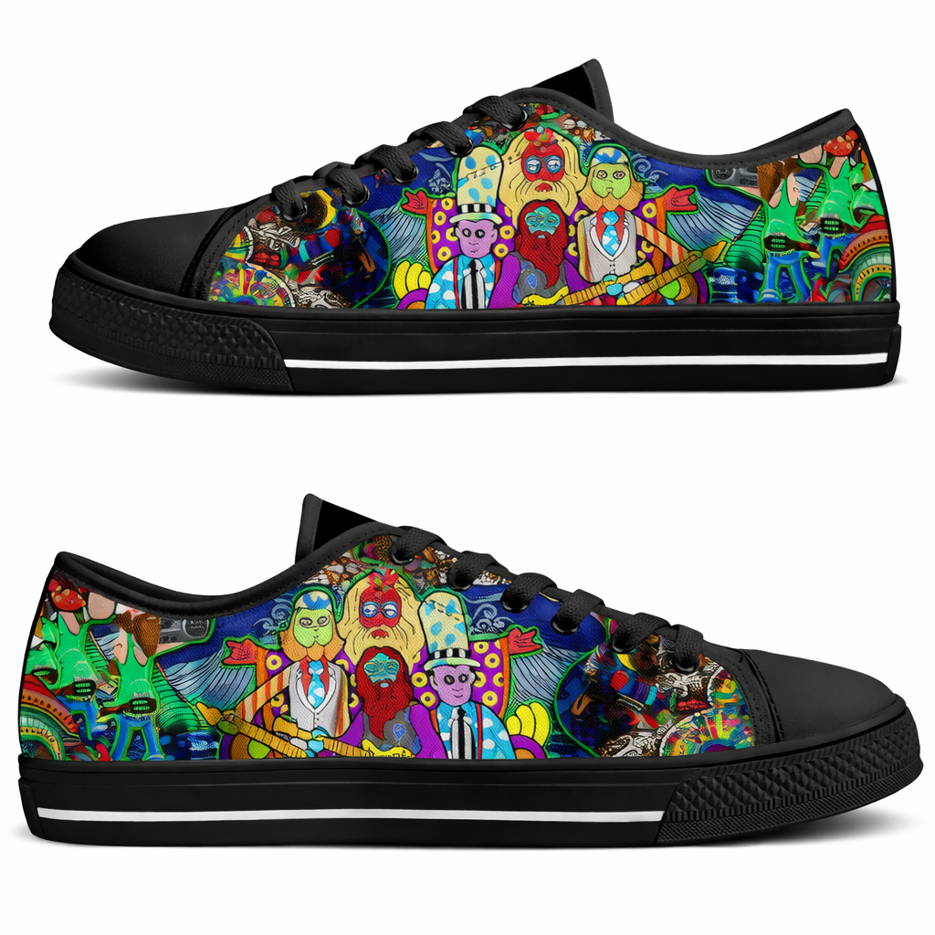 ️🎸 Groove to the Beat: Step into a technicolor dream with these low tops featuring a funky, surreal rock band art style.